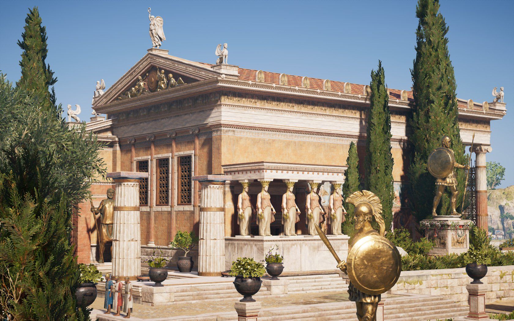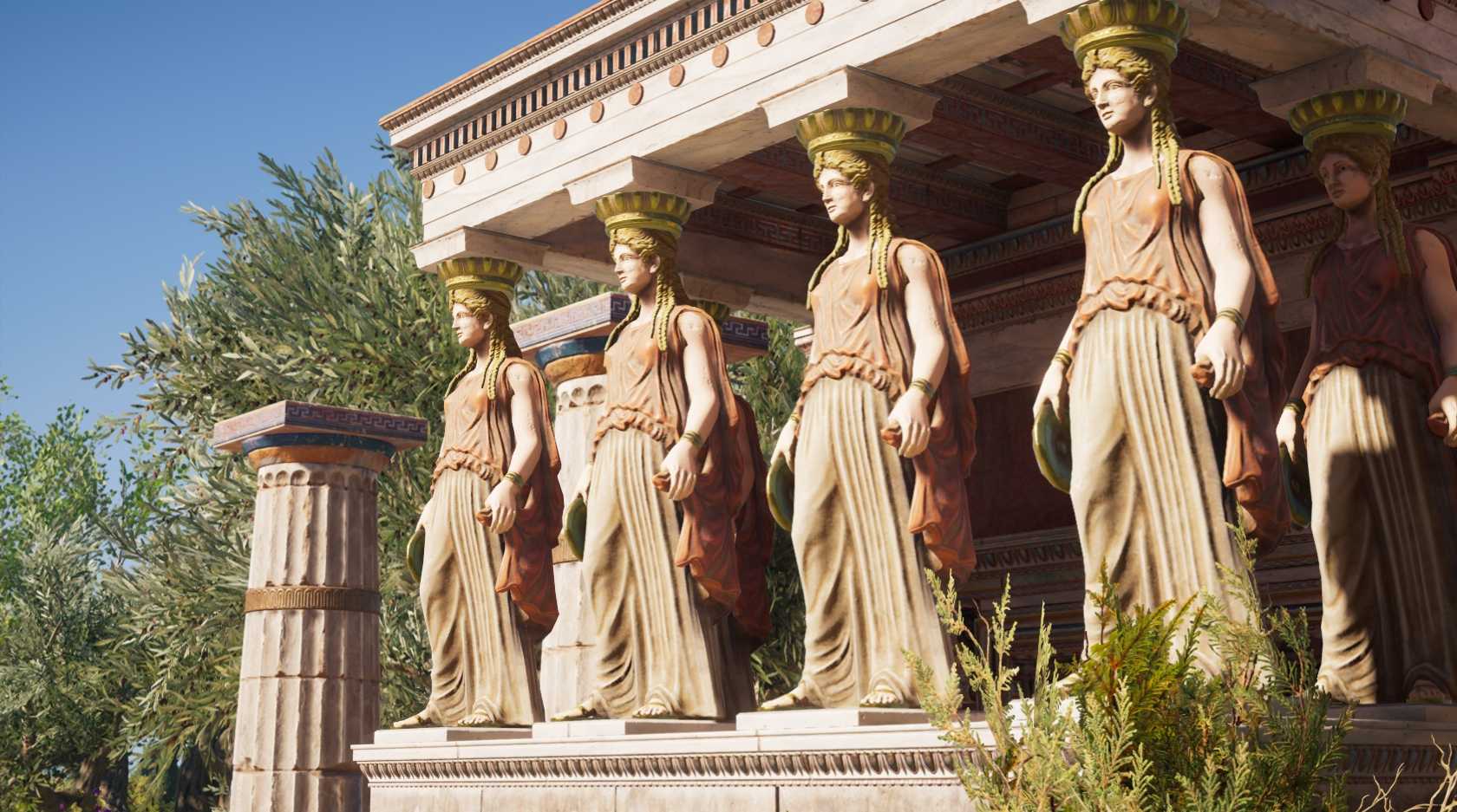 六尊少女像柱优雅地支撑着石顶,成为后世无数建筑的灵感来源。游戏里,玩家可以近距离观察这些女像柱的细节,甚至攀爬至神殿屋顶。