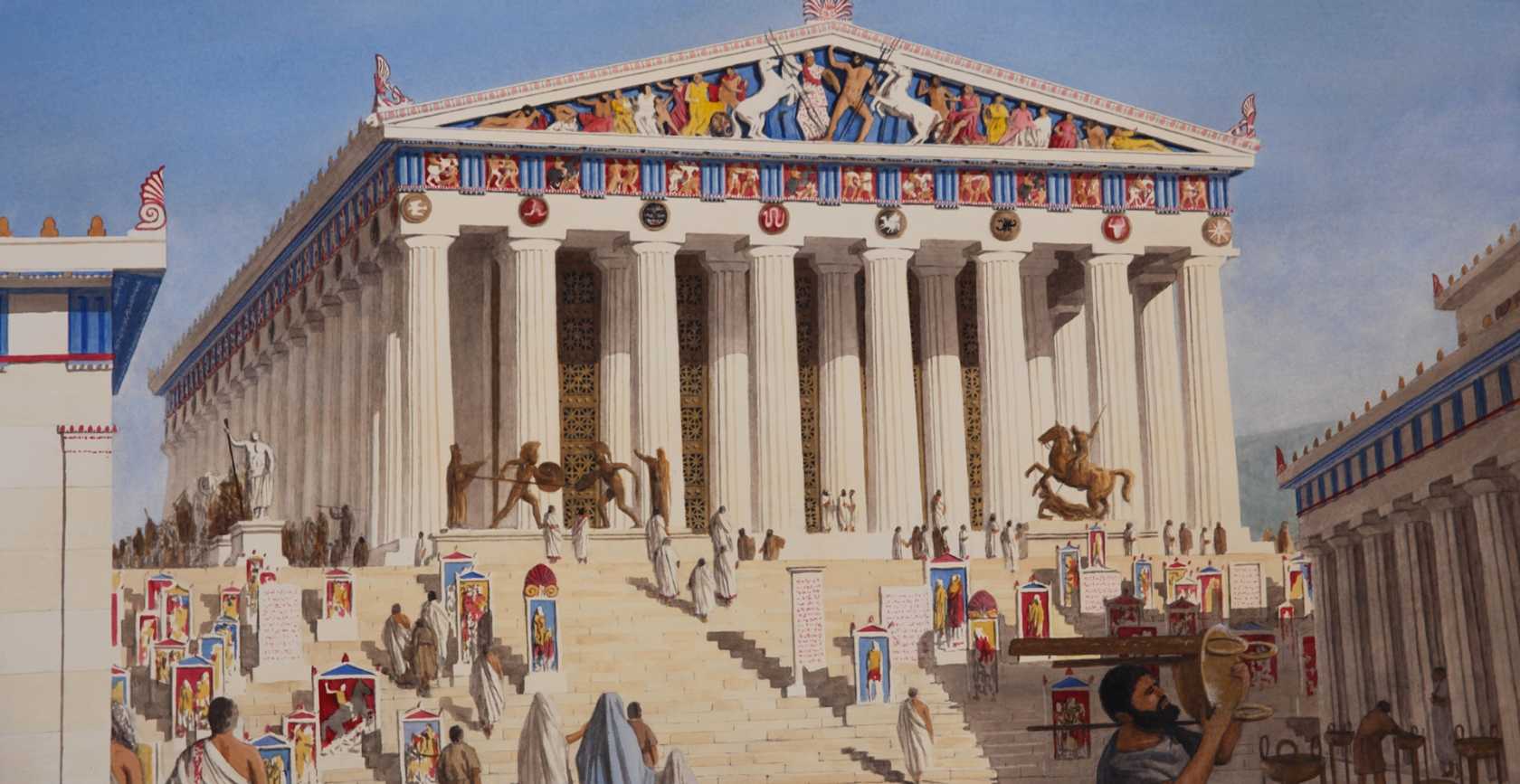 雅典卫城山门前的青铜雅典娜巨像是菲狄亚斯的杰作。在当时希腊人心中,雅典娜是智慧、和平与威力的象征,也是庇护他们战胜波斯人的救星。这尊巨像矗立在雅典卫城山门前,是雅典城精神的象征,激励着雅典人民,展现着城邦的辉煌与实力。