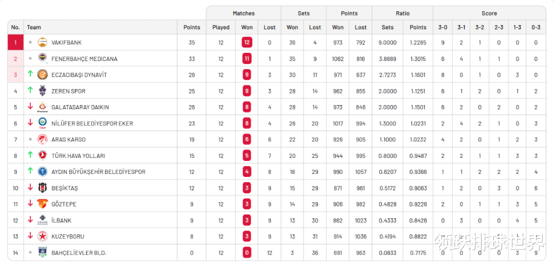 凭借这场胜利,伊萨奇巴希的战绩提升为9胜3负,反超加拉塔萨雷升至联赛第3位,仅次于瓦基弗银行和费内巴切,继续在争夺四强席位上掌握主动,加拉塔萨雷则以8胜4负滑落至第5位,赛季进入中段,各队都在为季后赛席位展开激烈角逐,伊萨奇巴希女排的强势回暖将为接下来的赛程增添更多看点。