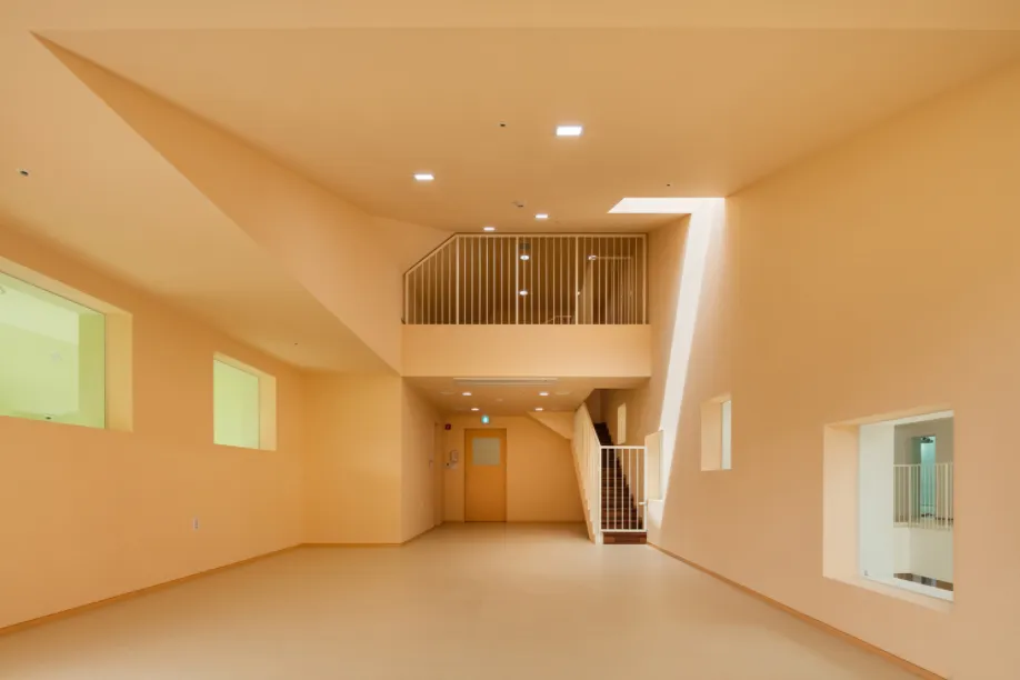 光影是自然界最神奇的魔法,也是孩子们乐此不疲的游戏素材。韩国Hangdong幼儿园就把光分割成了大大小小的形状,引入了室内每一个空间。
