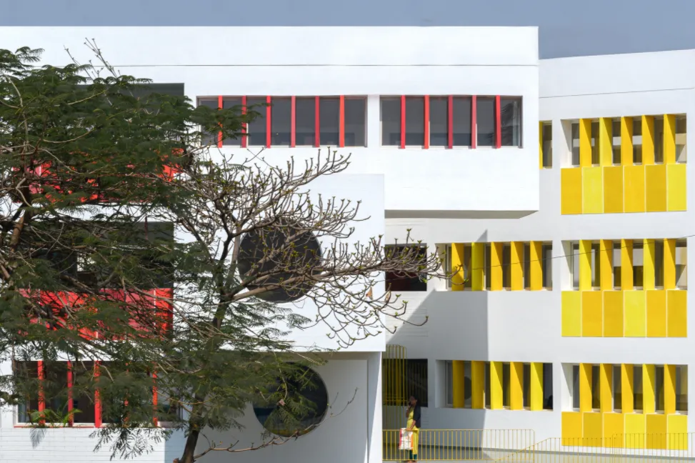 Sanskruti学校位于印度戈卡克,它是在现有校园内专门设立的幼儿园。其建筑外观上最大的特点就是色彩鲜艳、形态各异的窗户。这些几何形态的开窗,让学校成为了当地社区最引人瞩目的地标。
