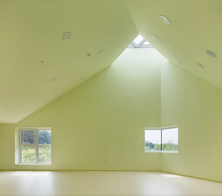 幼儿园的墙壁上布满了矩形的窗户,这些常规开窗为室内提供了水平尺度上的自然光照,保持了室内的亮度。建筑顶部不规则的窗户则为室内提供了更多变化的光线。