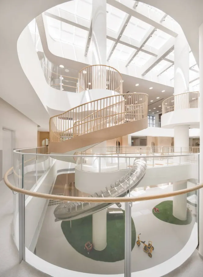 这是一个在当地很有名气的蒙特梭利幼儿园,其最负盛名的是三层采光中庭,以及足有两层楼高的旋转滑梯。这样的环境设计,让整个幼儿园成为了一个大型游乐场。