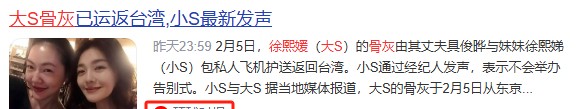 2月5日,大S的骨灰已经从日本运送到了中国台湾的家里。