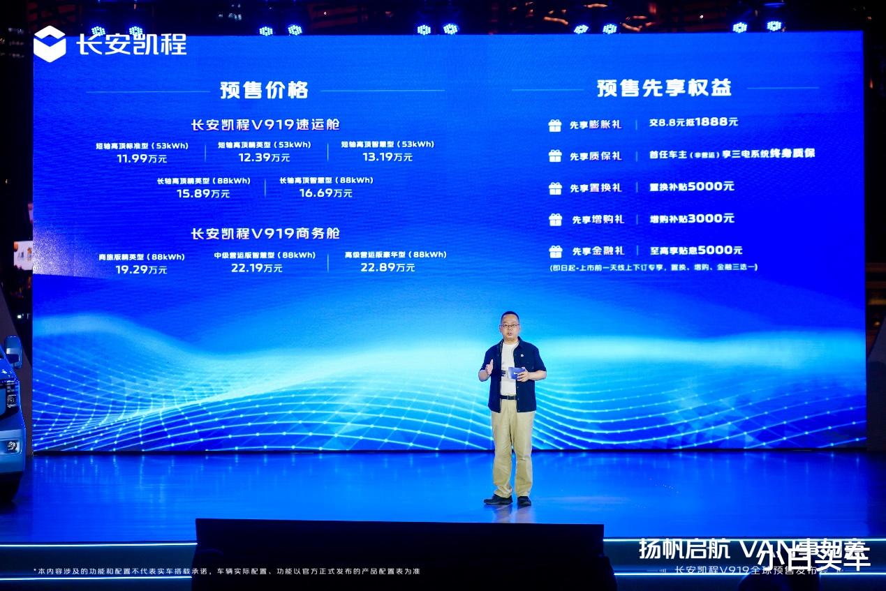 扬帆启航,VAN事如意!4月28日,长安凯程V919全球预售发布会盛大举行。明日数智轻客——长安凯程V919正式开启预售,长安凯程V919速运舱预售价11.99万元起,长安凯程V919商务舱预售价19.29万元起。