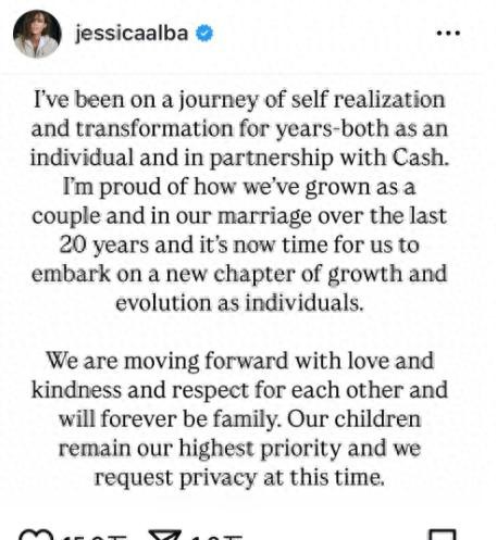 这二十多年,他们经历了什么?是爱情慢慢变淡了?还是生活磨平了棱角?咱们吃瓜群众当然不知道内情。不过,从阿尔芭的声明来看,两人是和平分手的,还强调以后还是家人,这感觉还挺体面的。想想看,这在好莱坞分分合合的娱乐圈,也算是一股清流了。两人官宣离婚,声明中充满了爱意和尊重,这真的让人意外又感动。 要知道,好莱坞的离婚大战,通常比电影情节还精彩,各种撕破脸、财产纠纷的戏码,比比皆是。但阿尔芭和沃伦,却选择了体面地告别,这值得我们竖起大拇指!