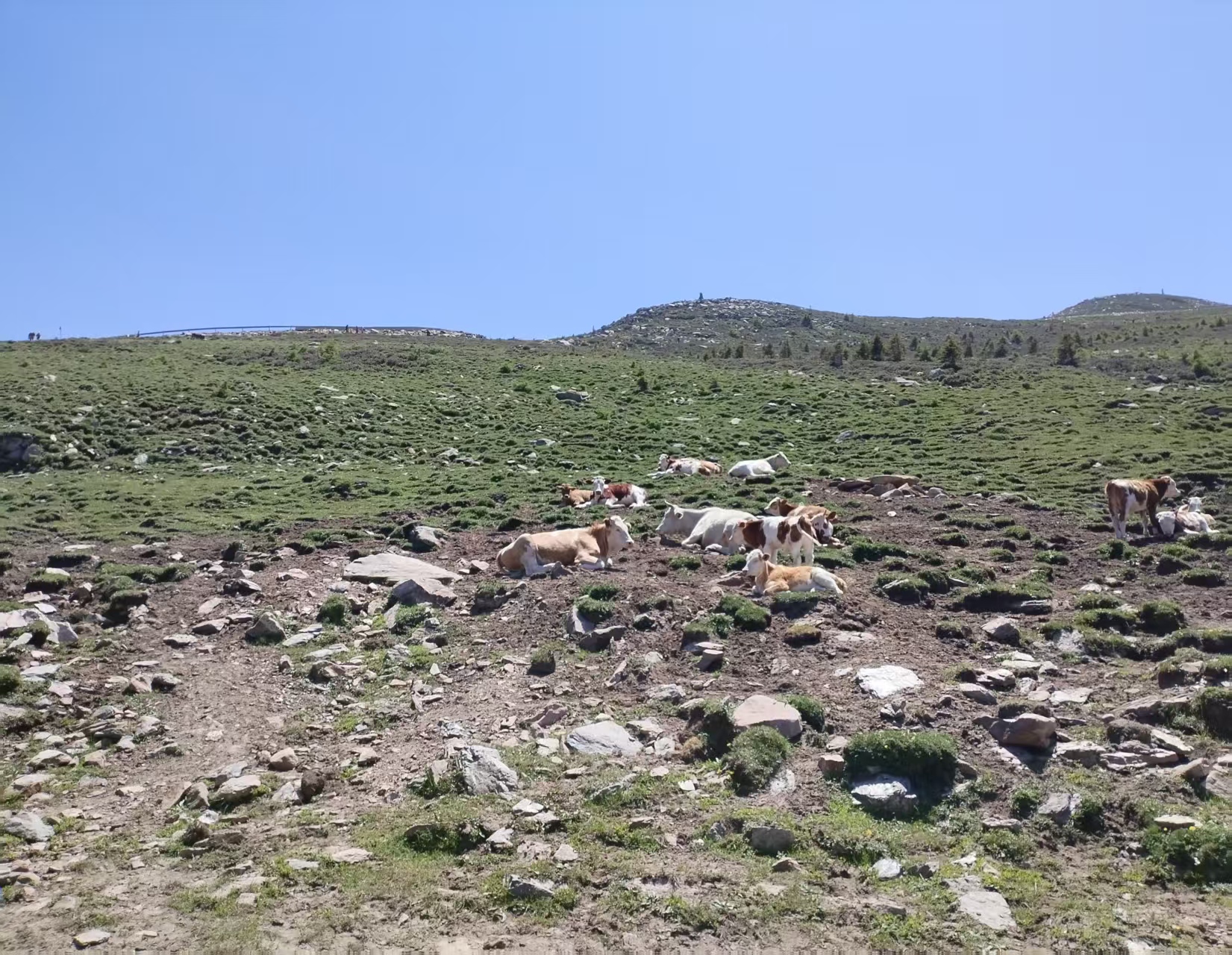 我二人走过坡路,来到平坦路段,路旁的草地上有几头牛或卧或低头啃草,另一旁则是满布荆棘的山坡。