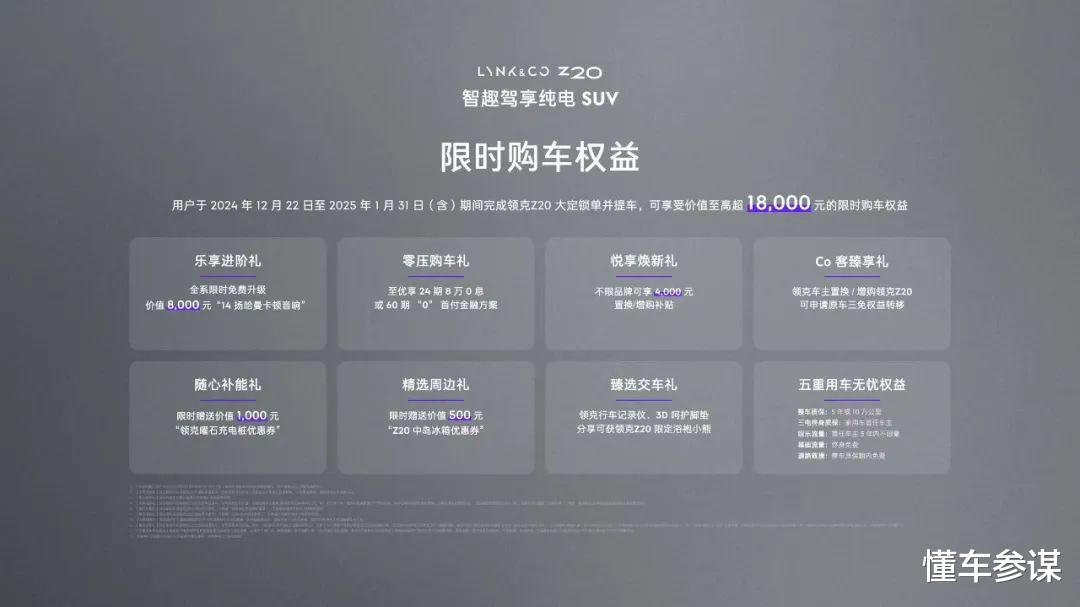 上市同时,领克Z20还为广大用户推出了多重购车权益,在 2024年12月22日至2025年1月31日(含)期间完成领克Z20 大定、锁单并提车的用户,可享受价值至高超1.8万元的限时购车权益。