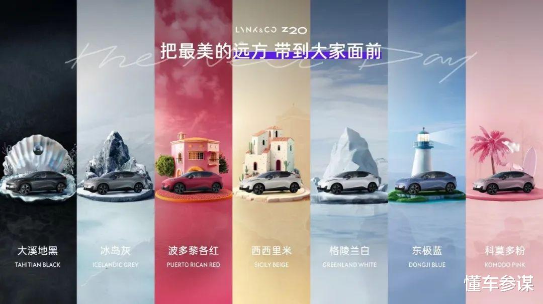 车色方面,领克Z20带来7款源自世界不同时区不同岛屿的自然车色:格陵兰白、大溪地黑、波多黎各红、科莫多粉、西西里米、东极蓝和冰岛灰,带给用户最特别的视觉享受。