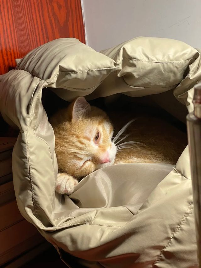 如果羽绒服帽子上有抽绳,可以把帽子翻到窝里,抽紧抽绳,立马变成一个带“小帐篷”顶的豪华猫窝。