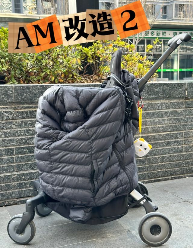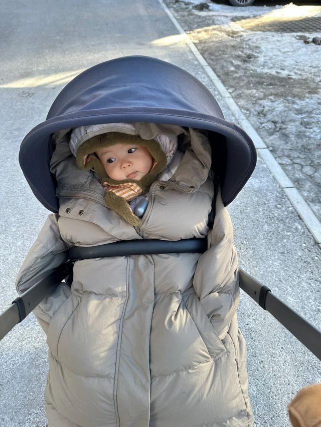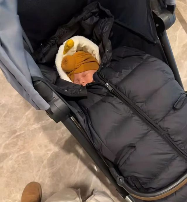 这样,宝宝的腿和身体就被包裹在一个温暖的羽绒“睡袋”里了。出门遛弯,就算宝宝睡着了,也像裹着小被子一样安稳。