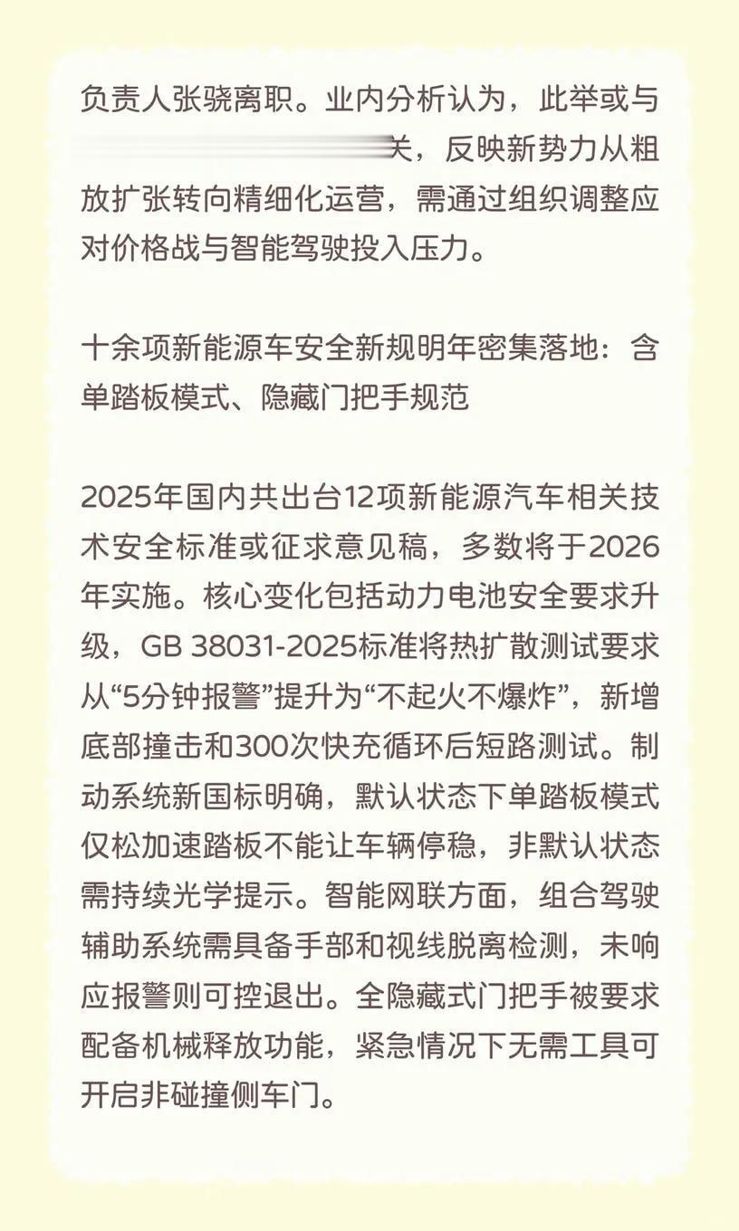 2025年国内共出台12项新能源汽车相关技术安全标准或征求意见稿,多数将于2026年实施。核心变化包括动力电池安全要求升级,GB 38031-2025标准将热扩散测试要求从“5分钟报警”提升为“不起火不爆炸”,新增底部撞击和300次快充循环后短路测试。制动系统新国标明确,默认状态下单踏板模式仅松加速踏板不能让车辆停稳,非默认状态需持续光学提示。智能网联方面,组合驾驶辅助系统需具备手部和视线脱离检测,未响应报警则可控退出。全隐藏式门把手被要求配备机械释放功能,紧急情况下无需工具可开启非碰撞侧车门。