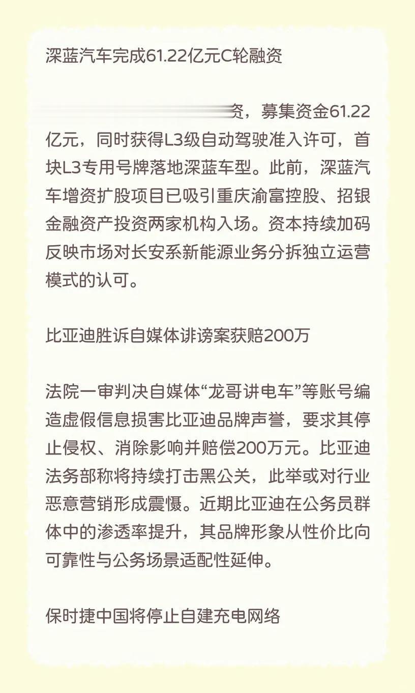 深蓝汽车宣布完成C轮融资,募集资金61.22亿元,同时获得L3级自动驾驶准入许可,首块L3专用号牌落地深蓝车型。此前,深蓝汽车增资扩股项目已吸引重庆渝富控股、招银金融资产投资两家机构入场。资本持续加码反映市场对长安系新能源业务分拆独立运营模式的认可。