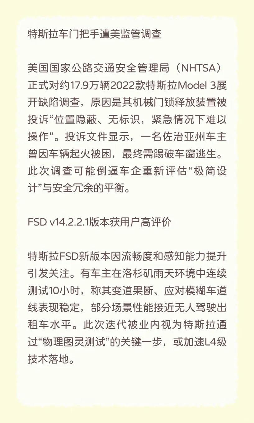 特斯拉门把手调查、FSD升级引关注,深蓝融资加速L3布局,宁德换电干线贯通推动行业标准升级。