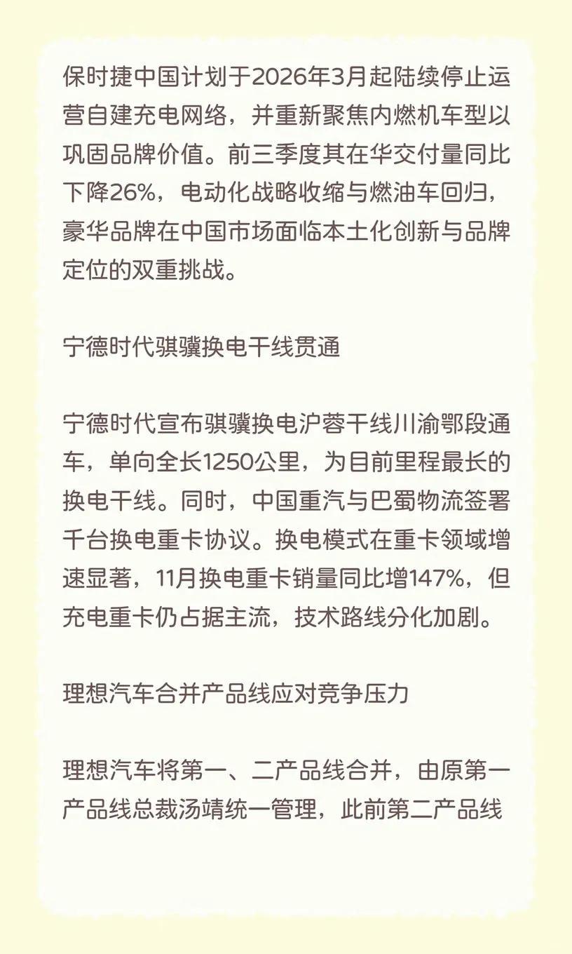 保时捷中国计划于2026年3月起陆续停止运营自建充电网络,并重新聚焦内燃机车型以巩固品牌价值。前三季度其在华交付量同比下降26%,电动化战略收缩与燃油车回归,豪华品牌在中国市场面临本土化创新与品牌定位的双重挑战。
