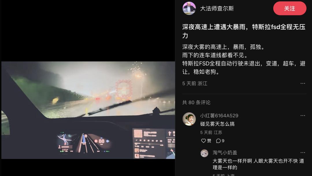 视频中,雨水像瀑布般倾泻而下,高速公路上的能见度极低,路面湿滑,前方车辆的刹车灯几乎隐没在雨幕中。任何一个经验丰富的司机,在这种情况下都会选择减速慢行,甚至停车等待雨势减弱。但特斯拉却不同,它凭借着FSD系统,稳稳地保持着90公里的时速,精准地识别路况,安全地完成超车和变道。这一幕让无数网友惊呼:“这简直是开了挂!”
