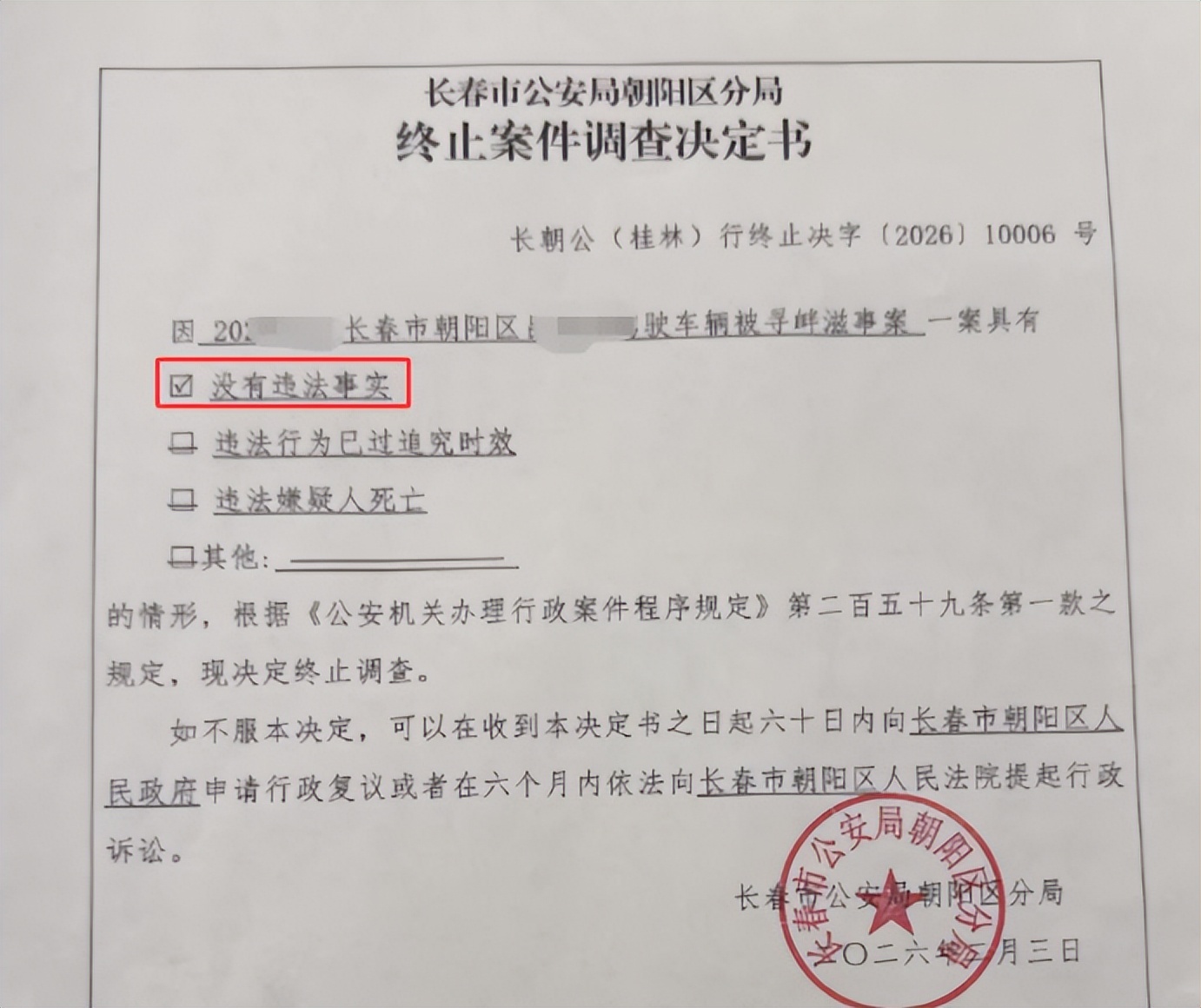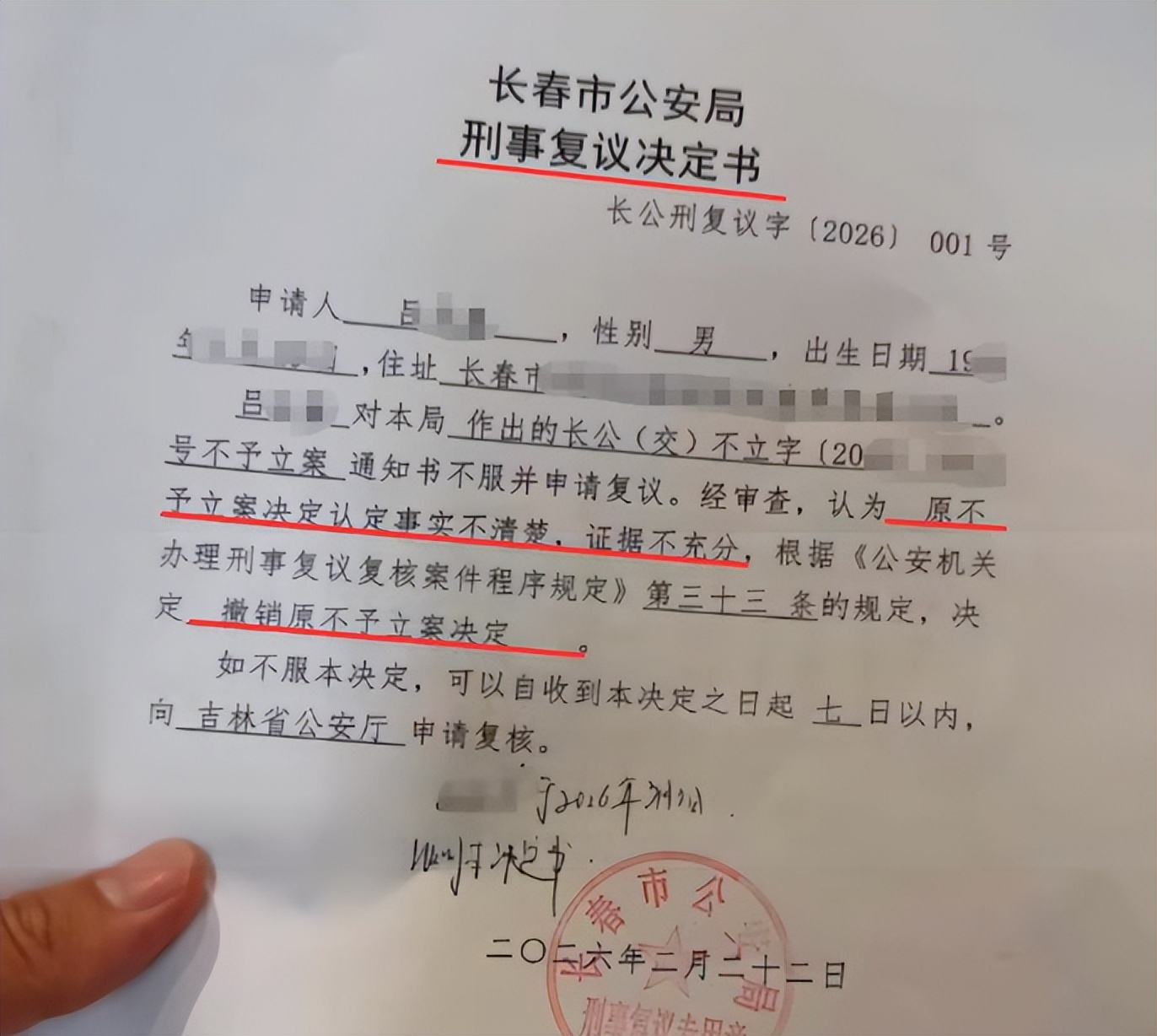 2026年3月3日,长春市公安局法制支队,针对此案做出刑事复议决定,