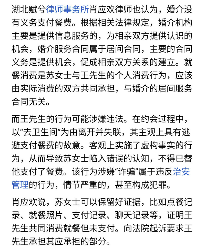 因为联系不上王先生,苏女士便找到婚介,希望他们解决餐费问题。