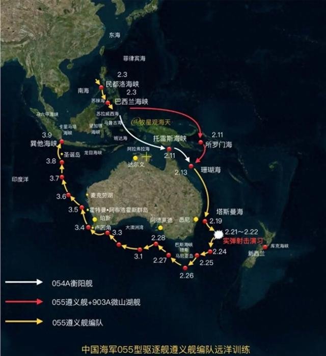 “遵义舰”编队的航线堪称一次精心规划的远洋之旅。从1月末启航至3月9日抵达巽他海峡,整个巡航历时40余天,途经多个国际关注的敏感海域,包括珊瑚海、澳大利亚近海和巽他海峡。这条路线不仅展示了中国海军的远洋能力,更以近距离的方式向外界传递了中国海军的现代化水平。
