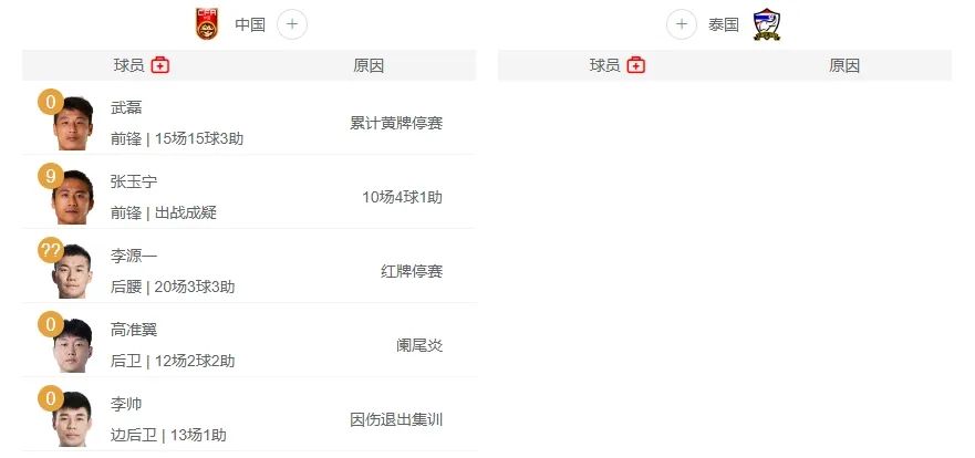 中国队方面,前锋武磊(俱乐部15场15球3助)黄牌停赛、张玉宁(俱乐部10场4球1助)或带伤出战,中场李源一(俱乐部20场3球3助)红牌停赛,后卫高准翼(俱乐部12场2球2助)、李帅(俱乐部13场1助)因伤退出集训。