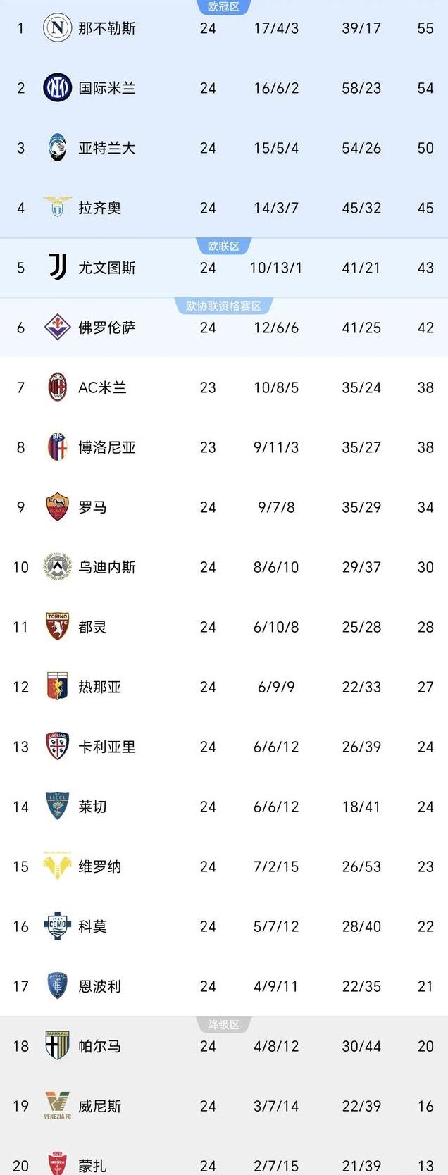 随着本轮比赛全部结束,意甲第24轮最终排名出炉!国米追至那不勒斯还差1分,争冠愈发激烈!另外,3队差3分争4,局势彻底乱了!