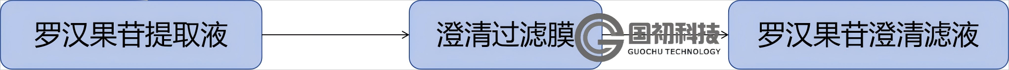 国初科技(厦门)有限公司根据多年的膜分离技术应用经验,开发出适用于罗汉果苷的澄清过滤膜。澄清过滤膜具有深层复合结构,适用高粘度物料,不仅能有效拦截颗粒杂质,对微小的杂质也有吸附去除效果。澄清过滤膜能提升罗汉果苷滤液品质,减轻下游提取工艺负担,对最终成品的品质提升也有帮助。澄清过滤膜采用死端过滤,无循环体积,收率高。其工艺流程图如下:
