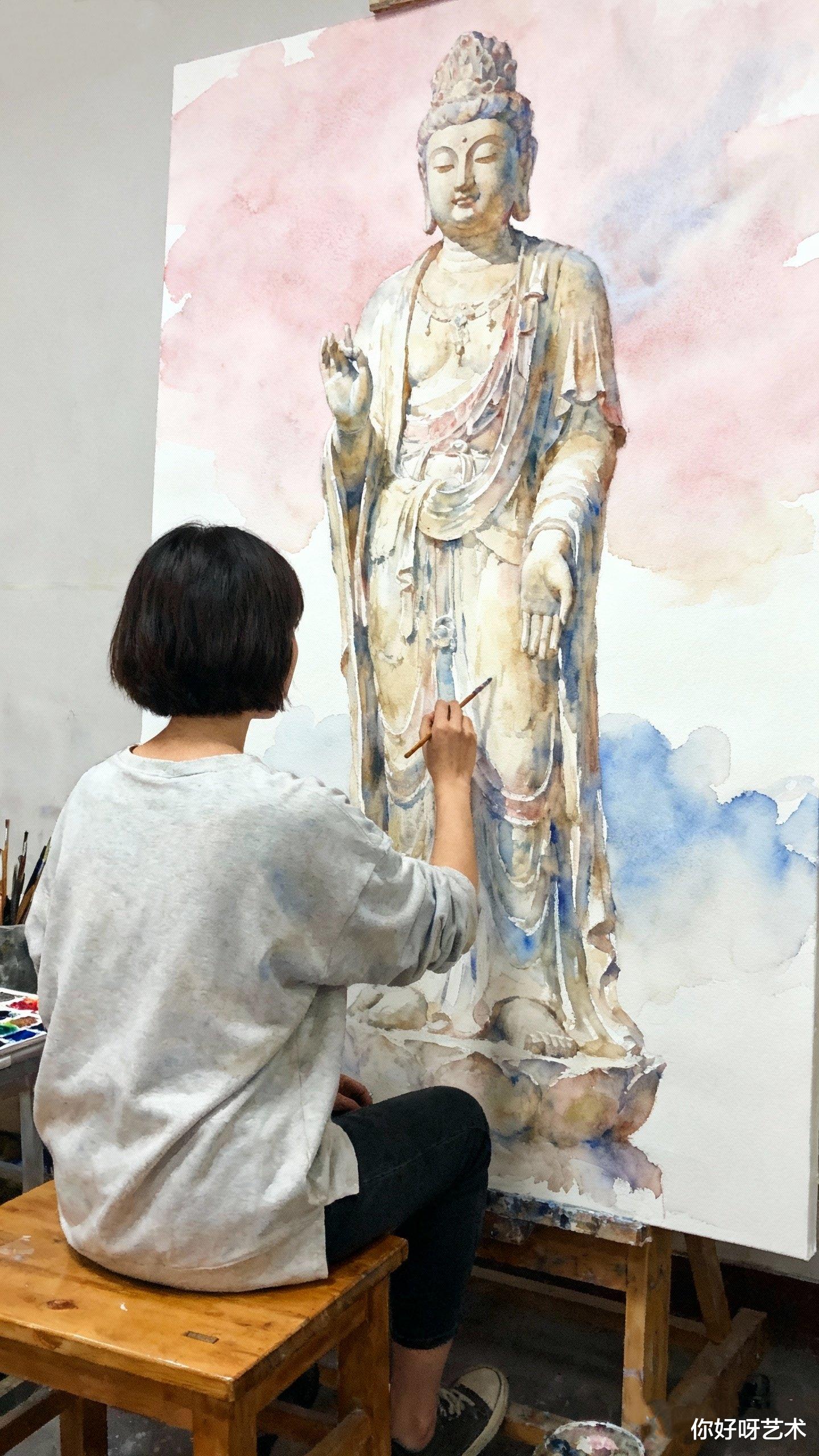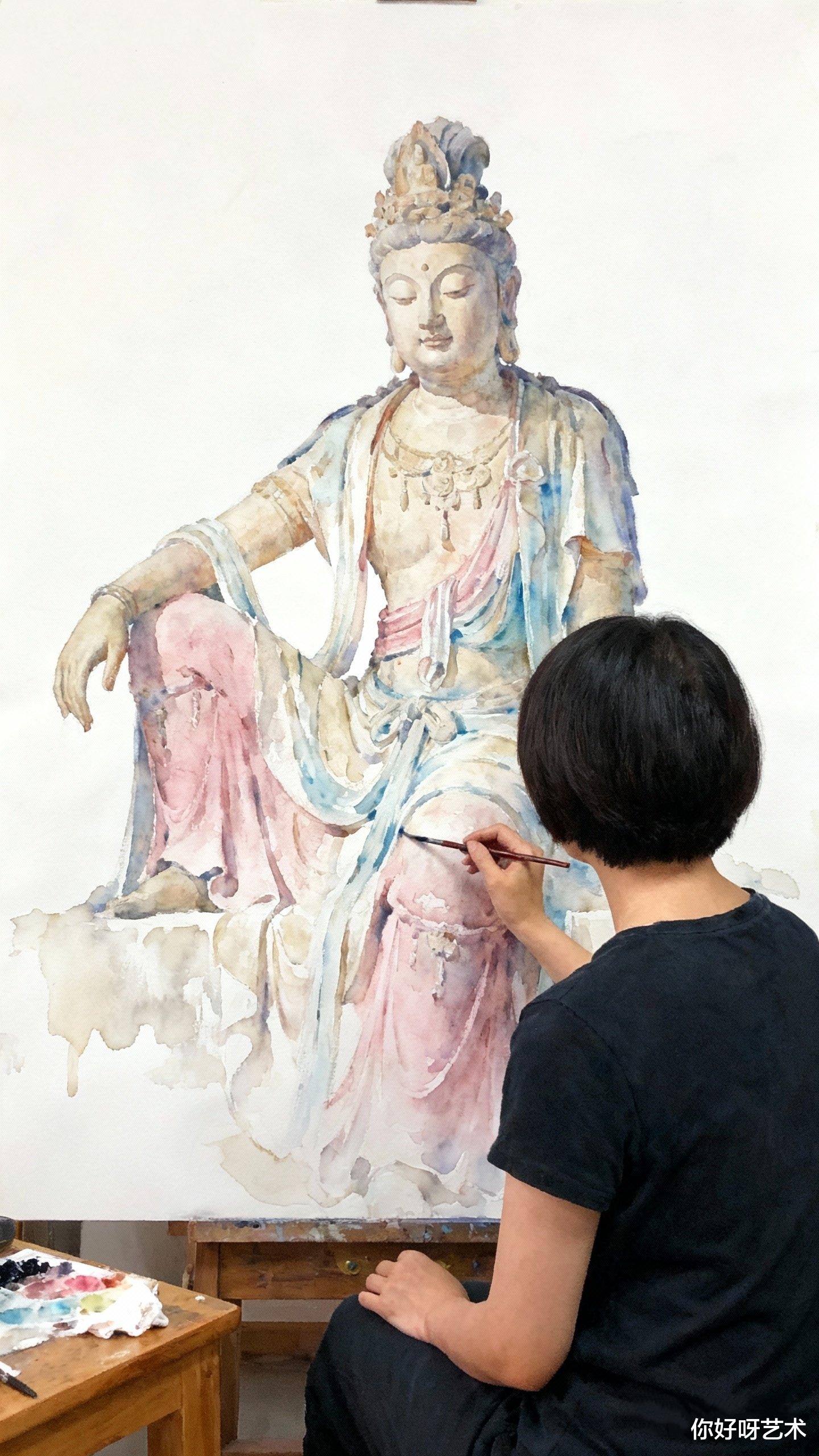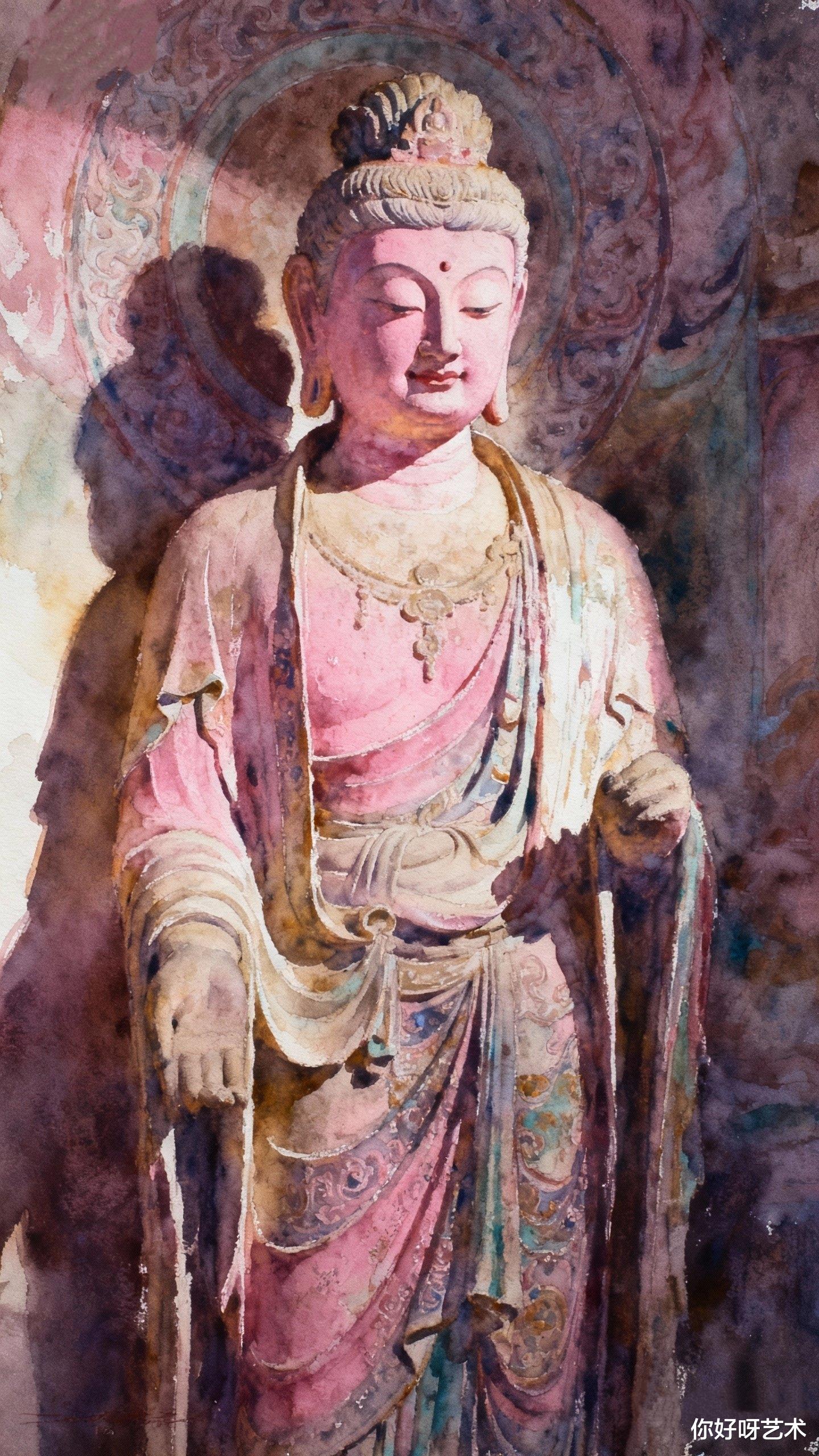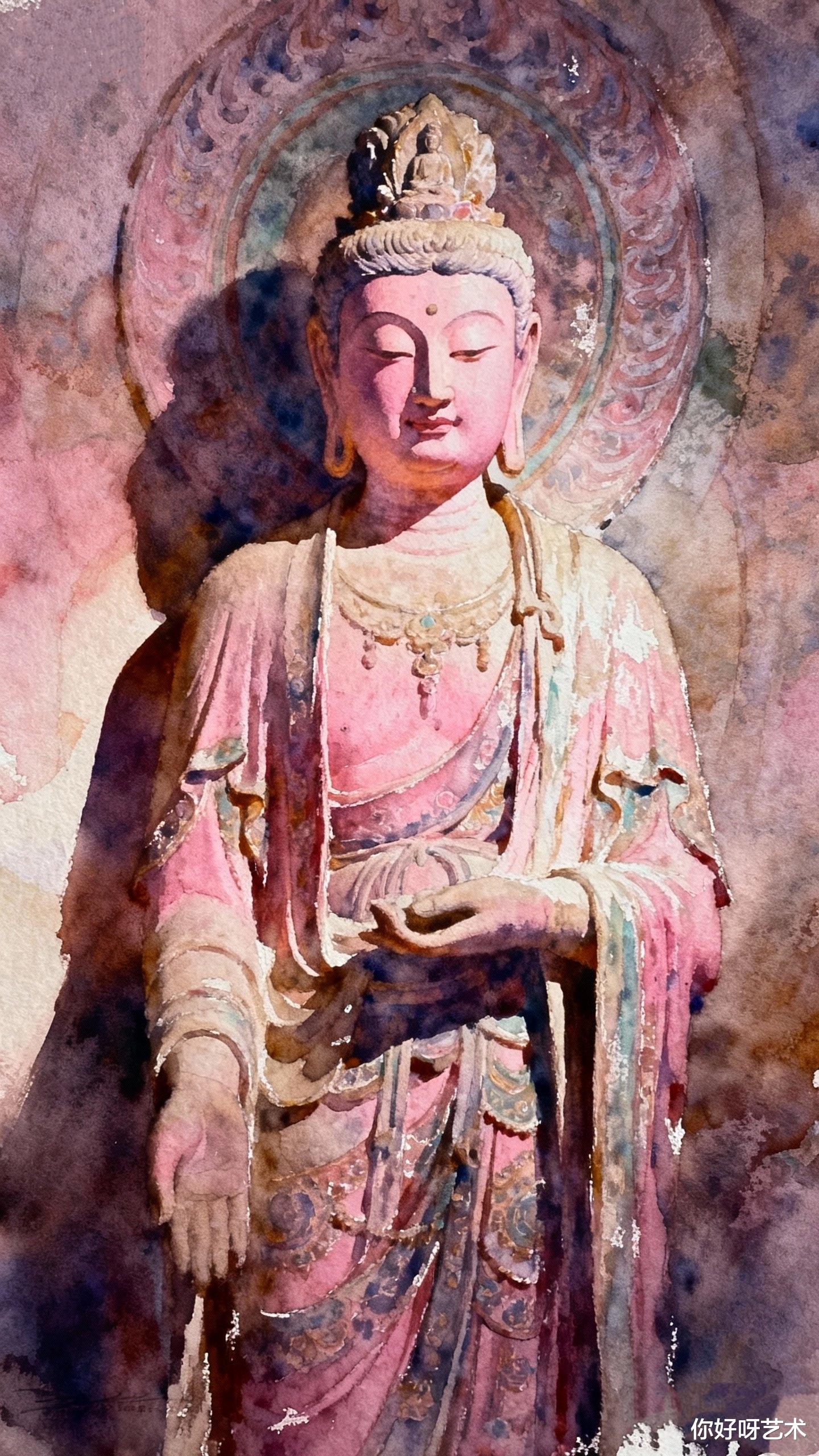 画到佛像的手,我用了浅绛。那是初春桃花的颜色,带着生命的温度。手指微屈,似在拈花,又似在抚慰众生。水彩的湿润让指尖有了血肉的质感,仿佛能感受到那手掌传递的温暖。我停下笔,凝视这未完成的佛像,忽然明白,画画的过程,何尝不是一种修行?每一笔都是对自我的审视,每一色都是对世界的感悟。水彩的流动,教会我顺应;颜料的叠加,教会我包容。佛像的庄严,不在形象的完美,而在心地的澄明。