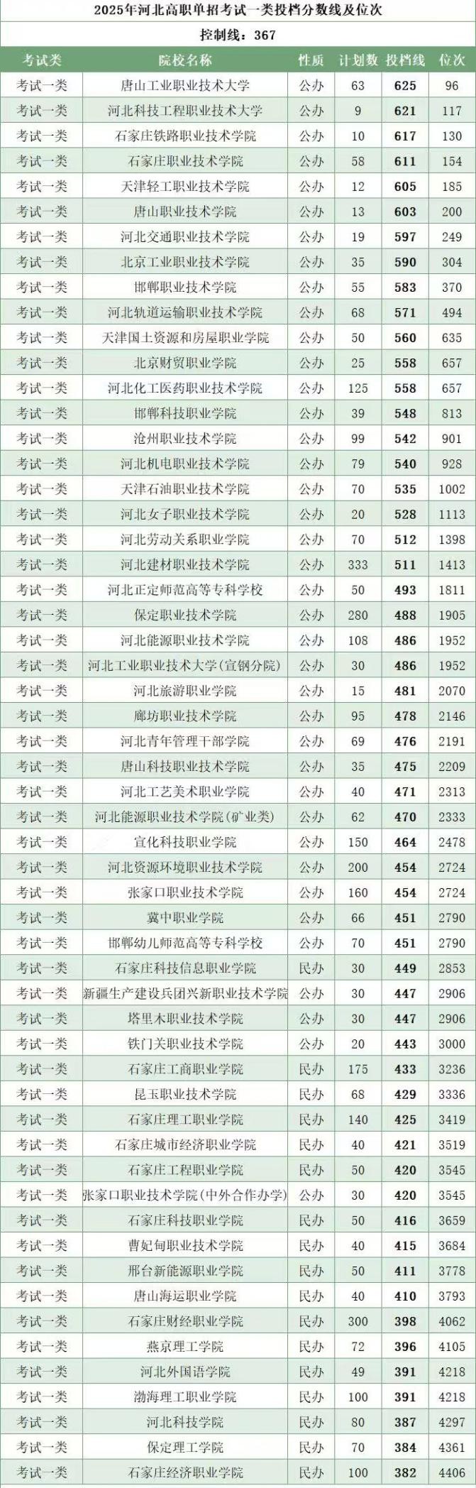 2025年河北单招一类的控制线为367分,但实际投档分数线差异较大,公办院校竞争激烈,民办院校门槛相对较低,具体可分为三个梯队: