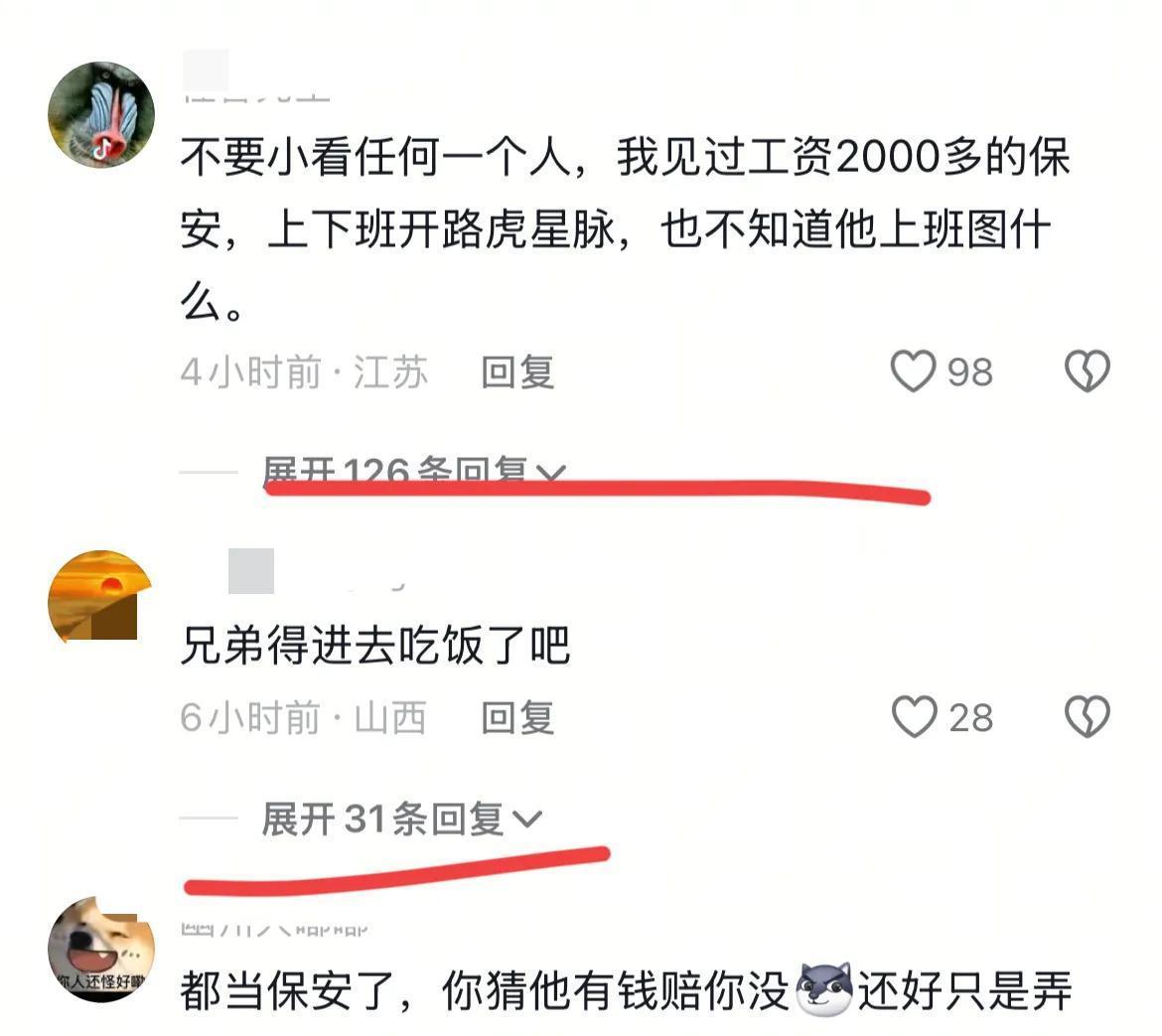 一些社交媒体用户对此事件的反应矛盾而分散。网友质疑这名保安的经济状况,认为他作为保安可能没有足够的赔偿能力,而对于车主而言,个人的权益固然值得保护,面对这样明显的损失他们也应当寻求合适的解决方案。更有一些人则在讨论保安事后处理的策略,认为应尽早赔偿以求得理解和宽恕。这些讨论中,尤其是围绕道德和法律责任的界限,引发了更广泛的社会思考。