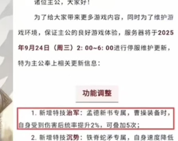 9月24日,曹操的专属装备特技治军进行了更新,按照之前SP法正、SP马超出新武将前先更新装备特技的习惯,曹操的专属装备可叠加到10%的统率,相当于加了20多的统率