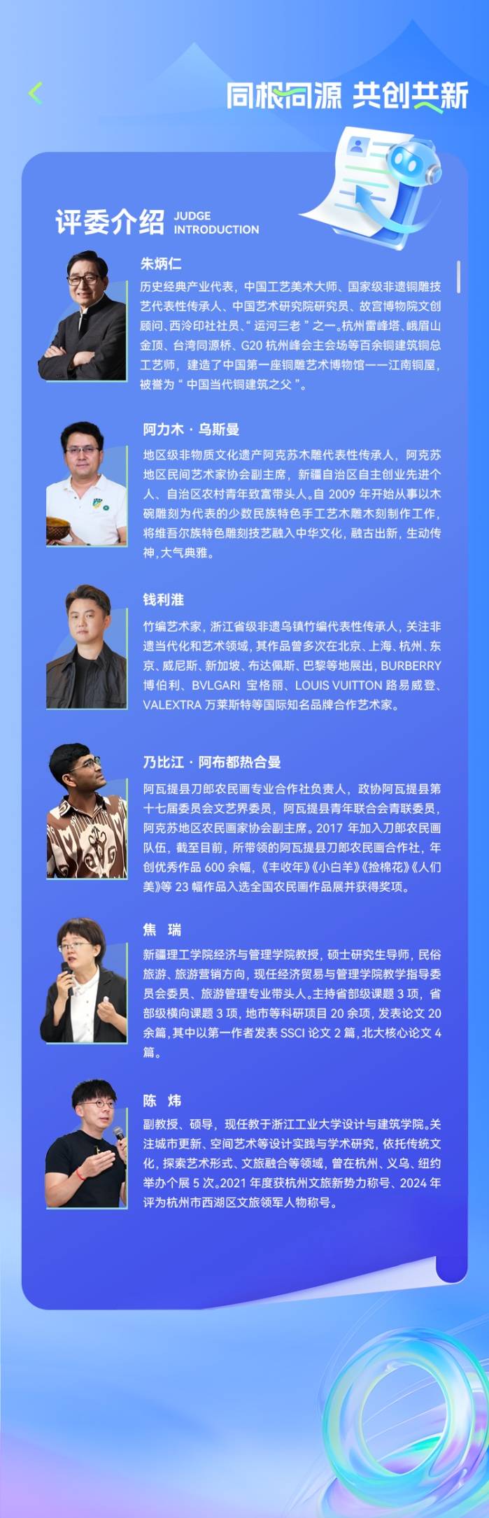 本届大赛评审团成员涵盖浙阿两地非遗代表性传承人、国家级工艺美术大师、高校艺术设计专业教授等资深专业人士,具备深厚的非遗文化研究功底与丰富的行业实践经验。在评审标准上,组委会制定了严格的四维度评分体系:文化传承维度重点考察作品对浙阿非遗文化内涵、历史脉络的把握与呈现;创新突破维度聚焦作品在传统工艺技法、表现形式与现代设计、科技手段融合中的创新点;艺术表现维度从色彩搭配、造型设计、审美感染力等角度评估作品的艺术价值;地域融合维度则着重考量作品对浙江、新疆两地文化元素的有机整合与创新性表达,确保作品既彰显地域特色,又体现 “同根同源” 的文化共鸣。