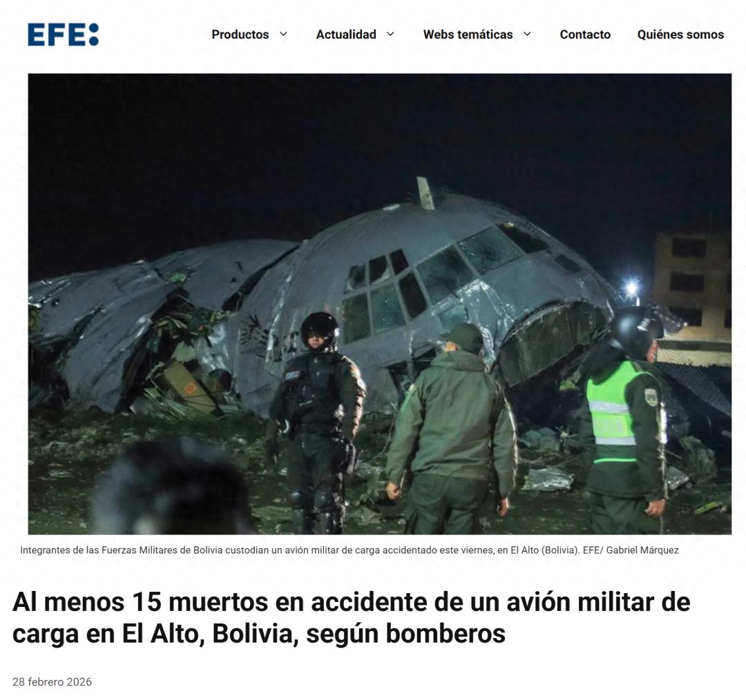 玻利维亚媒体援引消防部门官员消息报道说,当天下午,玻空军一架C-130“大力神”运输机降落在埃尔阿尔托国际机场时冲出跑道,撞上多辆汽车,造成至少15人死亡、多人受伤。事发后,玻民航部门宣布暂停埃尔阿尔托国际机场运营。
