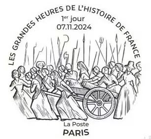 从2012年开始,法国邮政推出“法国历史上的伟大时刻”(LES GRANDES HEURES DE L'HISTOIRE DE FRANCE)系列邮票,按照从古至今的时间顺序,每年发行一枚重大历史题材的邮票。2024年发行的是法国大革命的题材,选取了革命过程中的一个事件——“十月事件”。“十月事件”是指法国资产阶级革命爆发后,1789年10月5日,巴黎发生大规模群众游行示威,由妇女带头向凡尔赛进发,要求国王路易十六批准《人权宣言》并保障巴黎粮食供应。路易十六被迫答应,并同意携带家属离开凡尔赛回到巴黎,制宪议会也随之迁往巴黎。