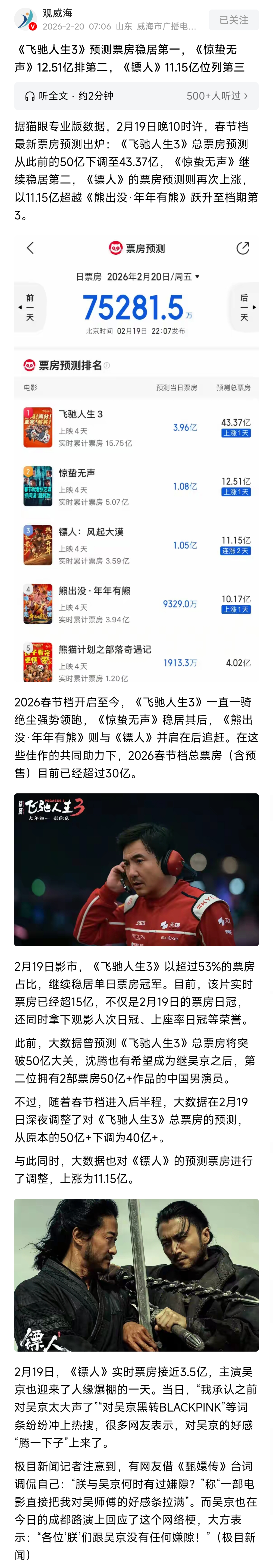 整体来看,2026年春节档总票房已经超过30亿,虽然《飞驰人生3》的50亿梦碎,但整个市场的活力还是很足的。这也告诉我们,电影市场从来不是一成不变的,就算是头部选手,也可能因为口碑、市场环境等因素受到影响,而那些被低估的作品,只要质量过硬、懂得抓住观众的心,就有机会实现逆袭。