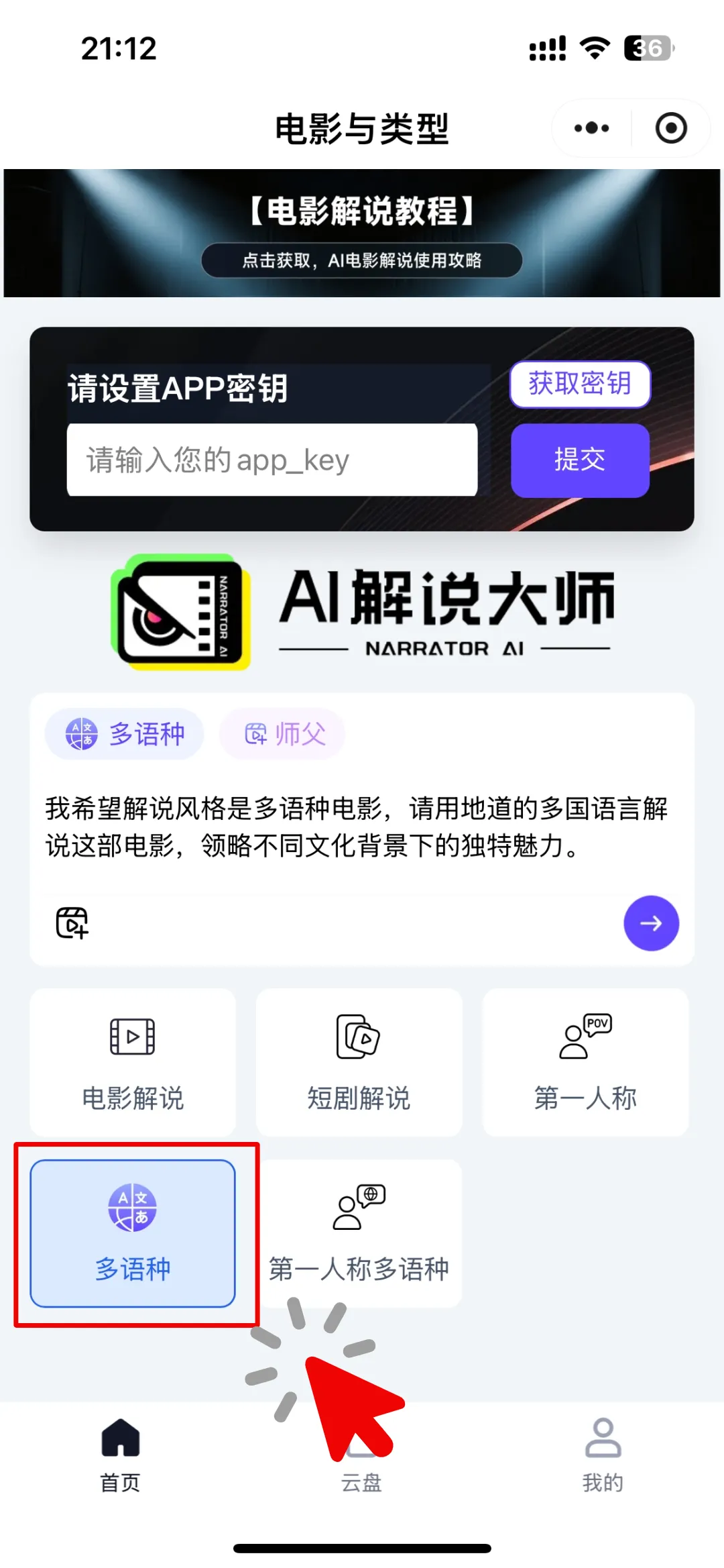 打开电影解说AI智能体(扣子平台搜"AI电影解说",或微信搜小程序"电影解说AI智能体"),在首页选择解说类型。如果你的目标是做海外矩阵号,直接选「多语种」或「第一人称多语种」。第一人称模式目前在TikTok上增长很快,沉浸感强、完播率高,非常适合悬疑和情感类影片。