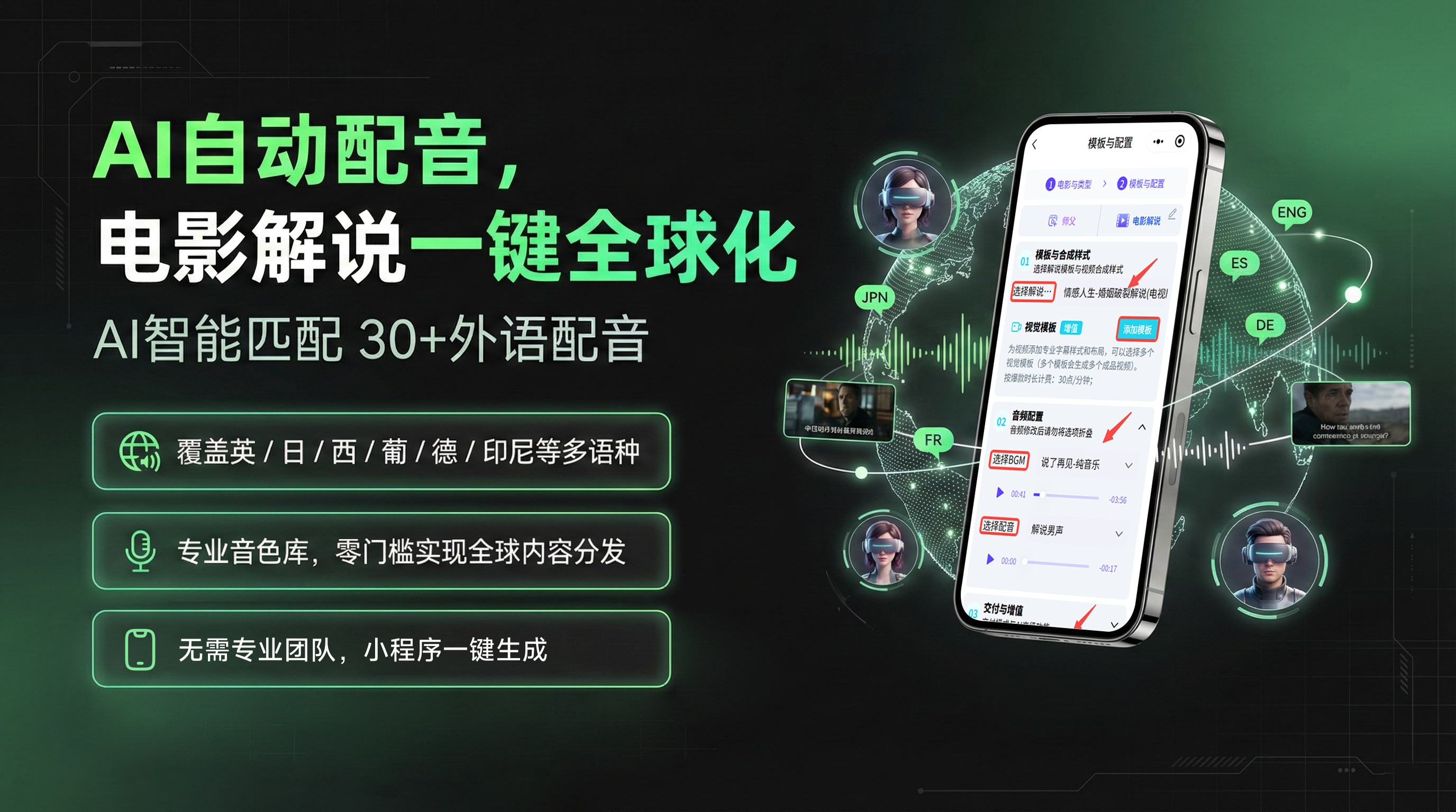 懒人模式:直接开启「AI自动配音」,系统自动匹配语种音色和背景音乐,一键搞定。
