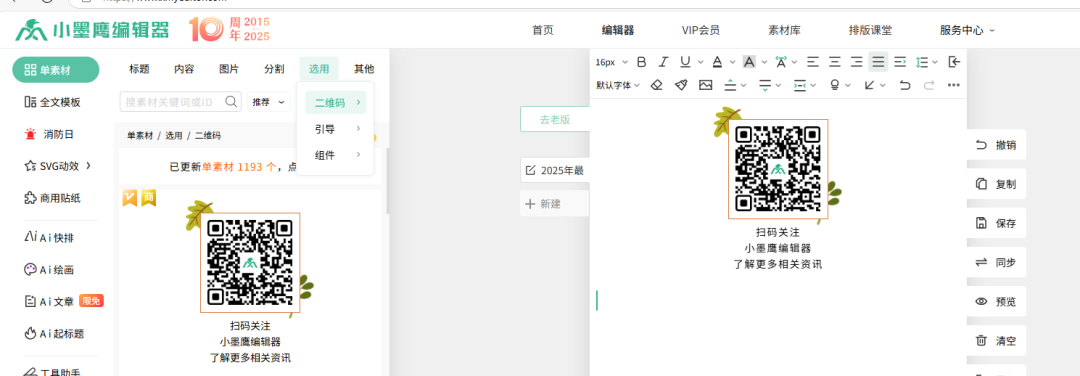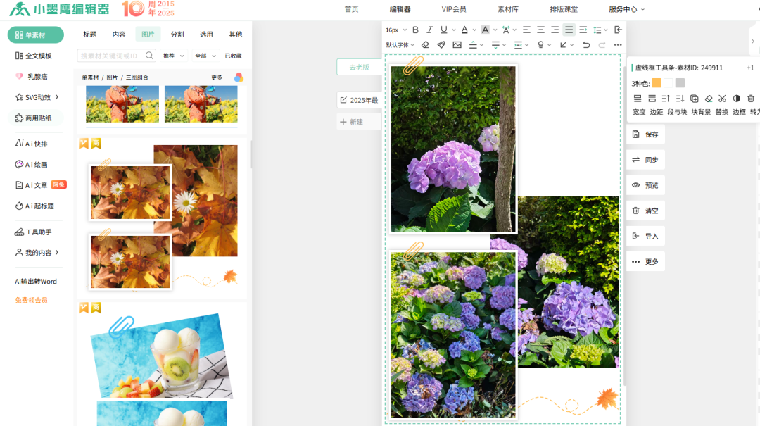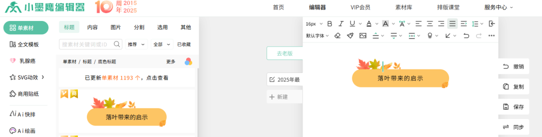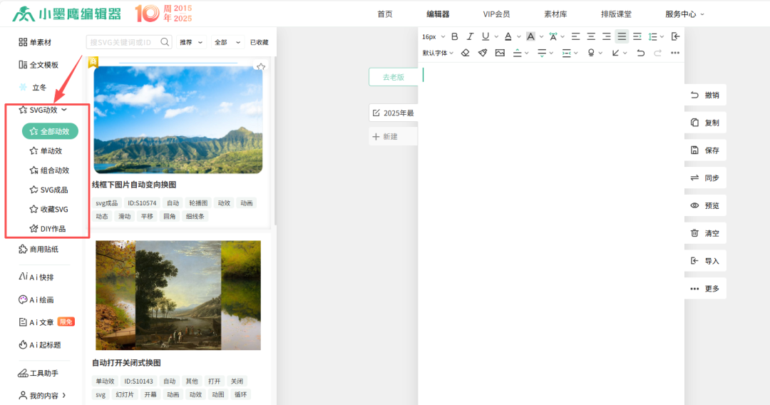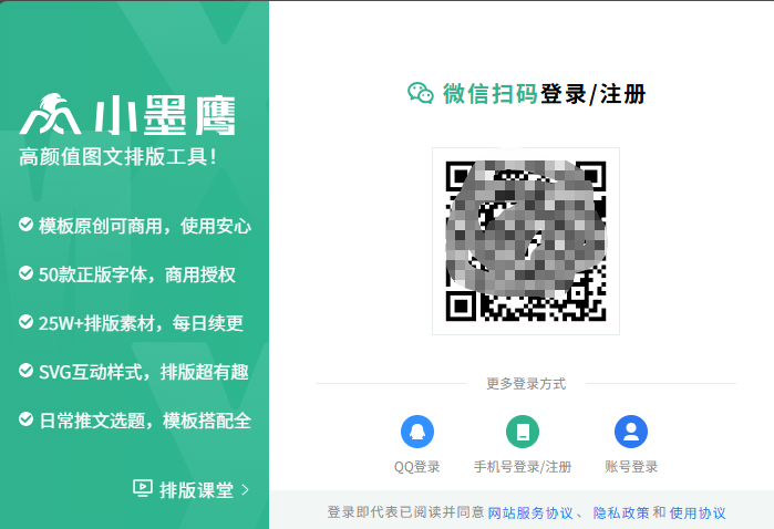 小墨鹰编辑器图文排版单素材多达25W+,10000+全文模版一键套用,3000+SVG动效素材,且每日更新,满足我们对素材的多样需求。