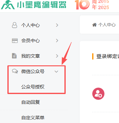 在【个人中心】找到【微信公众号】里面的【公众号授权】就可以设置公众号授权。