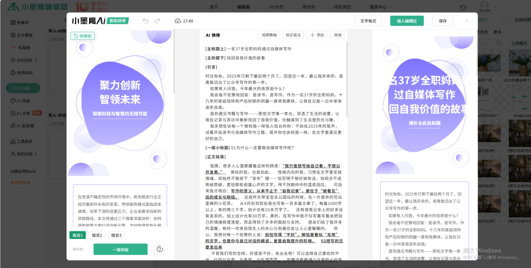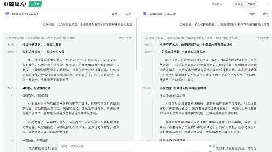 比如:我以“公众号排版神器,小墨鹰编辑器AI秒排帮你解决排版大难题”为例,很快就可以生成以下两篇文章。