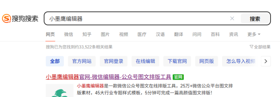 1、直接在浏览器中输入【小墨鹰编辑器】,选择官网