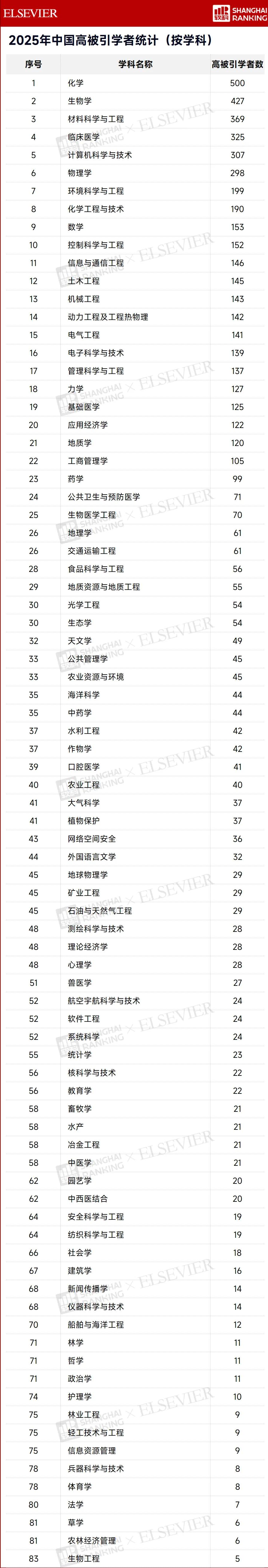 从上榜学科来看,本年度“中国高被引学者”覆盖83个一级学科。