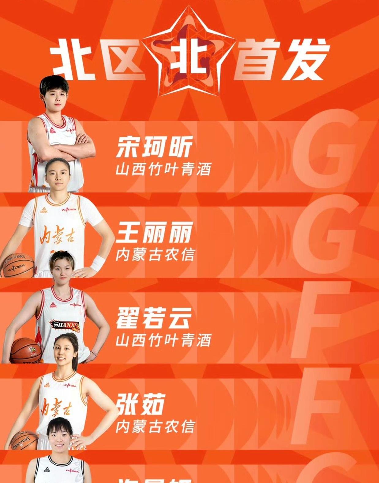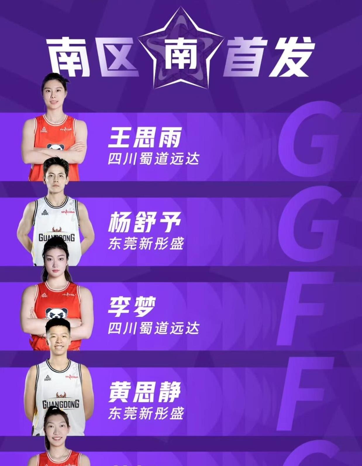 南区 vs 北区首发球员对比在南区的首发阵容中,我们看到了几位来自四川女篮和东莞女篮的杰出球员:中锋韩旭,小前锋李梦,大前锋黄思静,后卫杨舒予,以及另一位后卫王思雨。整体而言,南区首发阵容展现了更为卓越的技术实力。相比之下,北区的首发阵容则由几位同样出色的运动员组成:来自江苏女篮的巨人中锋许晨妍,身高达到2米;内蒙古女篮的大前锋张茹;山西女篮的小前锋翟若云;还有两位来自内蒙古女篮的后卫王丽丽,以及山西女篮的宋珂昕。尽管北区的阵容同样星光熠熠,但与南区相比,在技术表现上略显逊色。