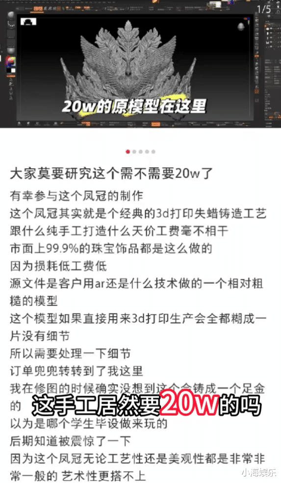 随后网上就有所谓“行业内人士”说,张凯毅的“纯手工”黄金凤冠光工费就要20万。而没想到一下子激怒了设计师圈子。不少设计师跳出来打假,实锤张凯毅撒谎!凤冠就是个机器3D打印的。并非手工作品。网友也质疑:这个说20万工费的怕不是张凯毅的“托儿”吧。