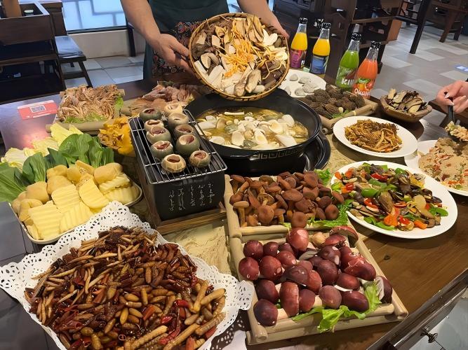 此外,野生菌火锅还催生了独特的“菌子宴”。一些餐厅会推出以野生菌为主题的宴席,除了野生菌火锅,还有煎烤野生菌、凉拌野生菌、野生菌炒饭等多种菜品,让食客们全方位体验野生菌的美味。同时,随着文旅融合的发展,采菌体验活动也越来越受到游客的欢迎,如玉溪易门县的“山林寻菌”项目,让游客可以亲自走进山林,体验采摘野生菌的乐趣,感受云南的山野风情。