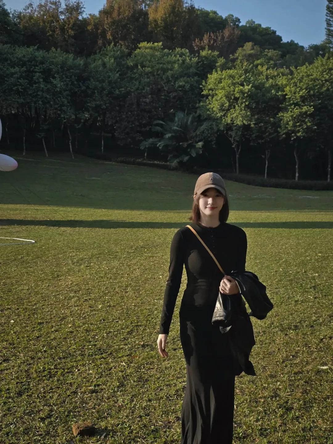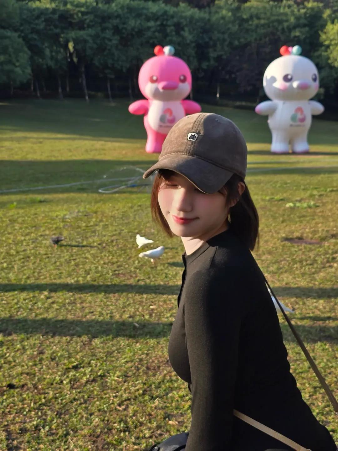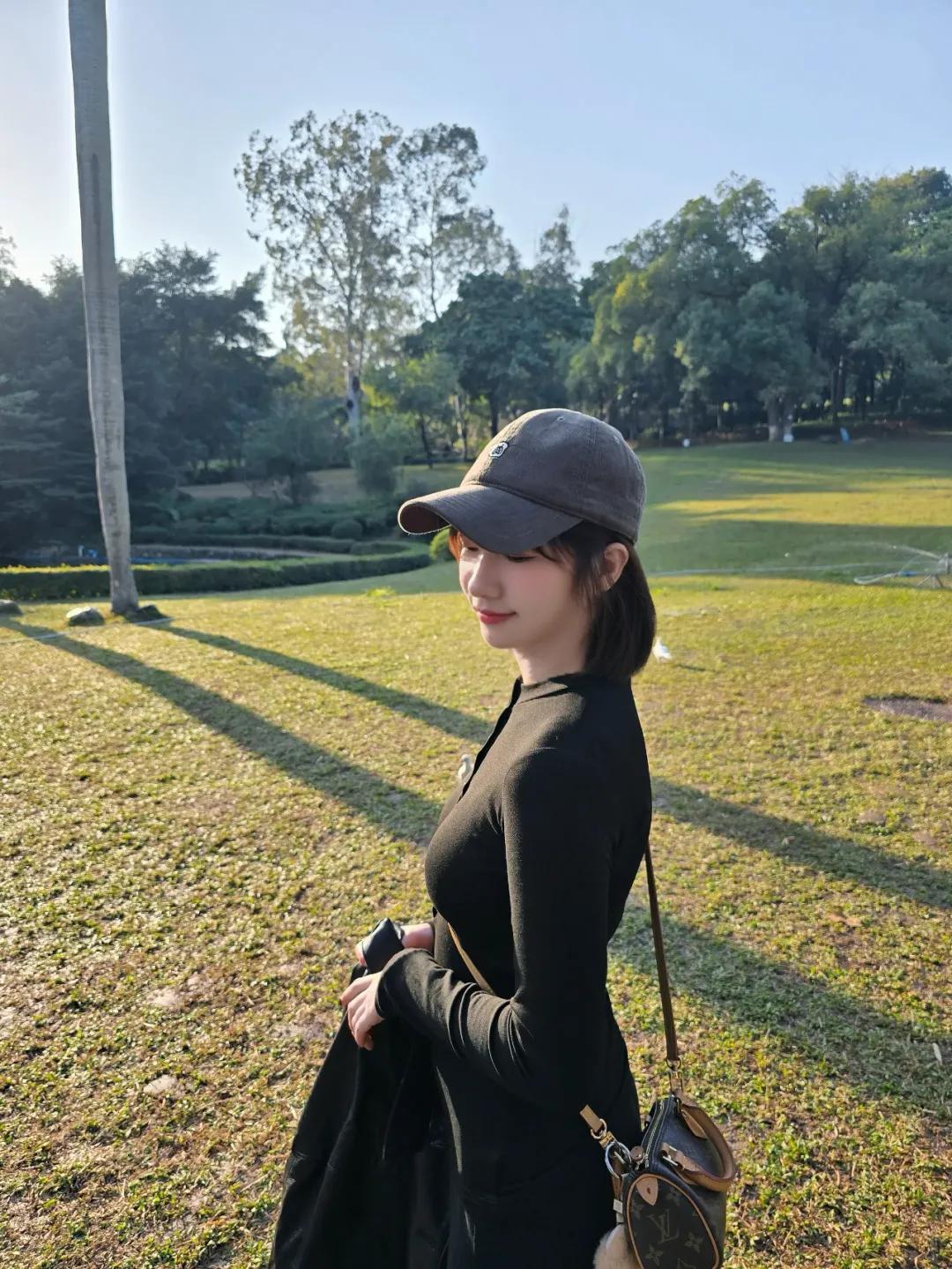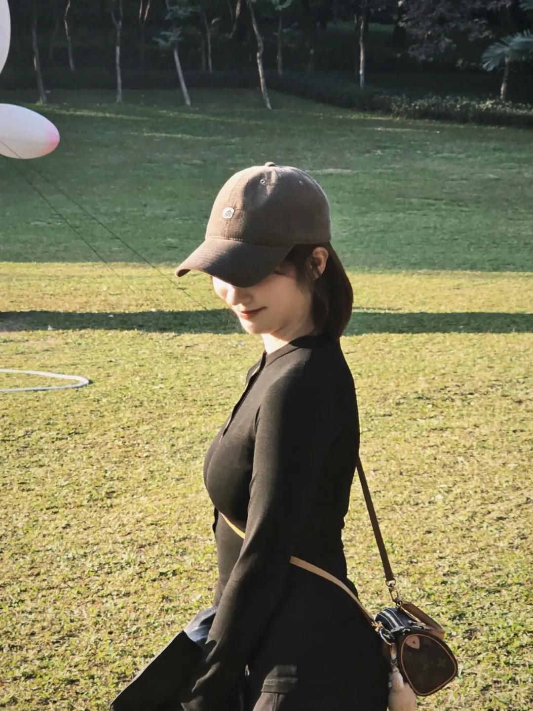 站在草坪上不看镜头而是看向一侧,其实是很常用的拍照技巧,侧身加上侧看,会让照片少一点摆拍感,多一点随意的状态,整体画面也会更耐看。
