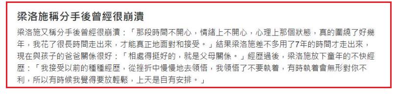 回忆当年,梁洛施表示自己很喜欢小孩,很想有个自己的家庭,也觉得自己碰到了一生挚爱(李泽楷),很有安全感。