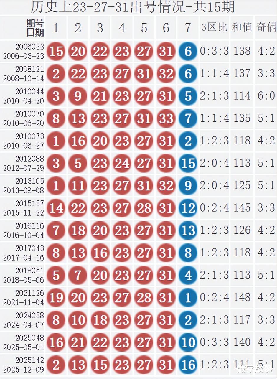 双色球2025142期红号在过去是否出现过?双色球2025142期红号: 2-13-15-23-27-31经查,历史上没有出现过与这一期6个红球或者5个红球号码一样的。与这一期4个红号一样的有10期,如下:
