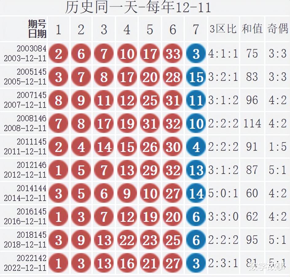博弈心理,挑战概率: 看近期开奖号码,也可看历史数据统计!【双色球25143期多角度冷热号】双色球25143期四维走势图,红蓝号统计及冷热号1) 历史同一天: 12月11日 (共10期)