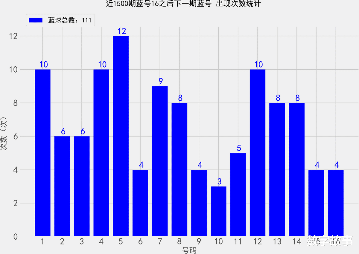 统计近1500期蓝号16之后, 各蓝球的出现次数双色球25142期蓝号是16找出近1500期蓝球16号之后, 下一期出现的所有蓝号,统计其出现次数。,除开这一期,总共出现了111次16号球那么统计的样本数据是111个