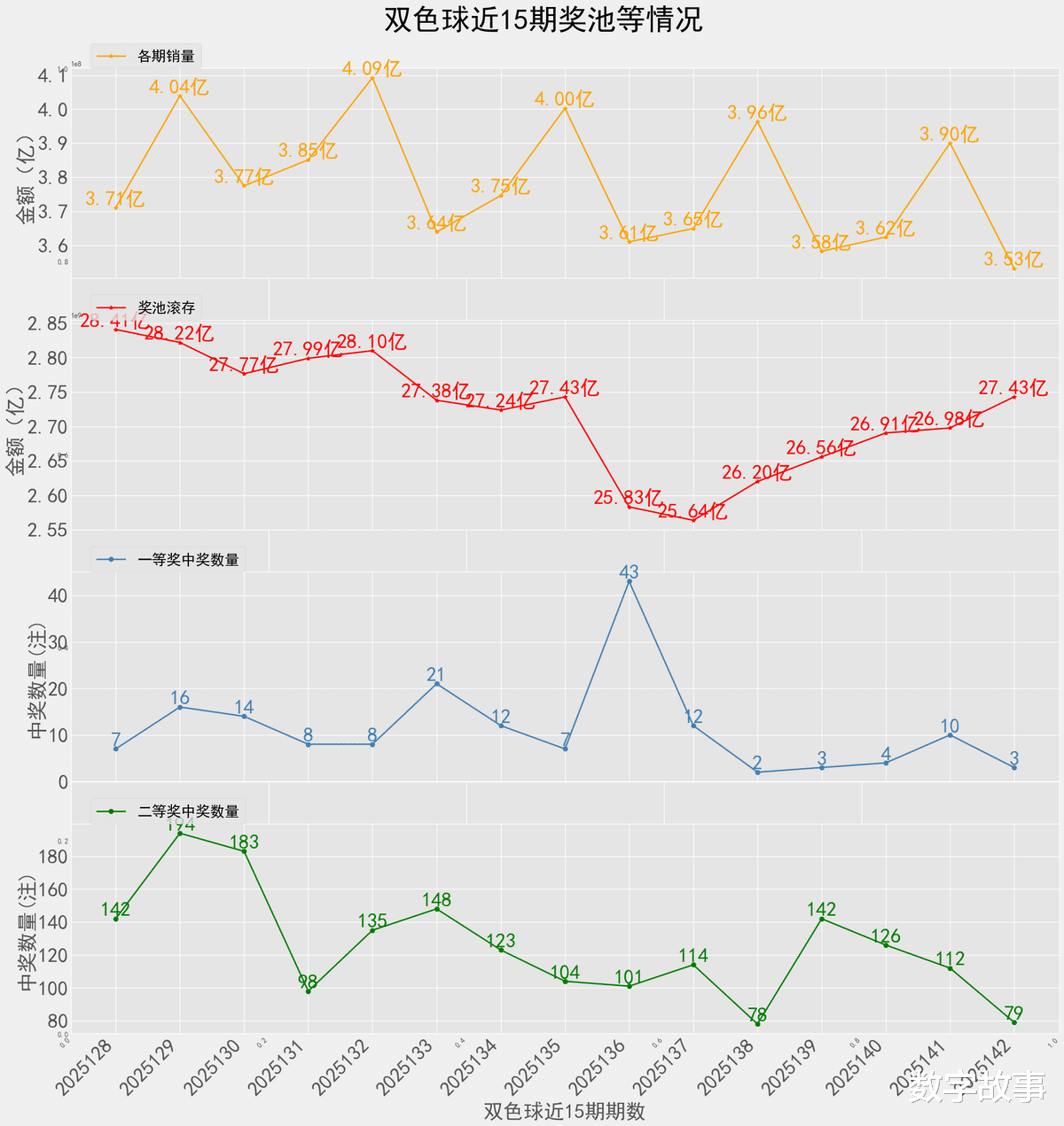 双色球25142期一等奖: 3注二等奖: 79注本期全国销售金额:353205678 元 奖池滚存:2743073255 元.近15期奖池滚存, 中奖情况等信息: